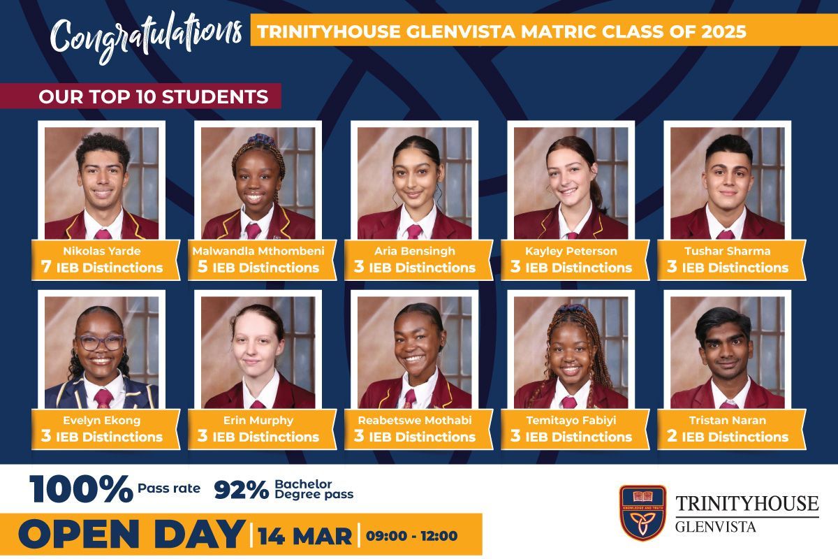 Trinityhouse Glenvista High School is a proud academic institution following the IEB curriculum, with MAP Benchmark testing in Maths and English from Grades 8-11. We use varied assessment methods to foster curiosity, critical thinking, and original thought.